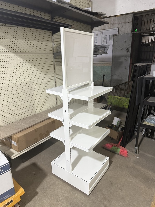 The retail store fixture assembles easily. Gondola retail rack with two shelves and a bottom base. Shelves can be adjusted height wise